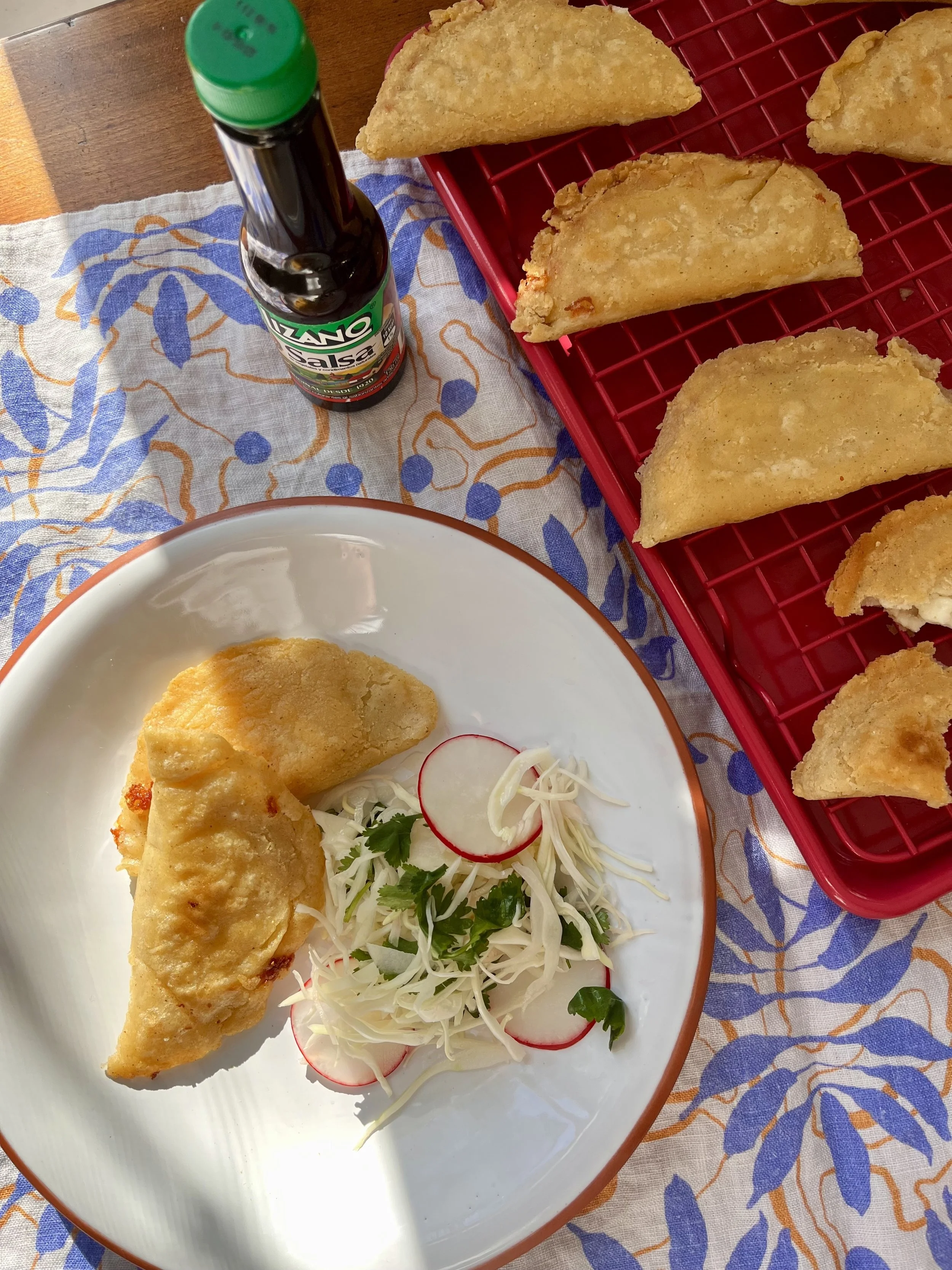 My grandmother is in her early 90s now, but she is still making empanadas for us—a miraculous feat! On a recent visit, she decided to make a small batch for us, instructing us on shaping and frying. I am grateful that I still enjoy them at her apartment and learn her cooking techniques. Here is my take on my grandmother’s empanadas de queso.