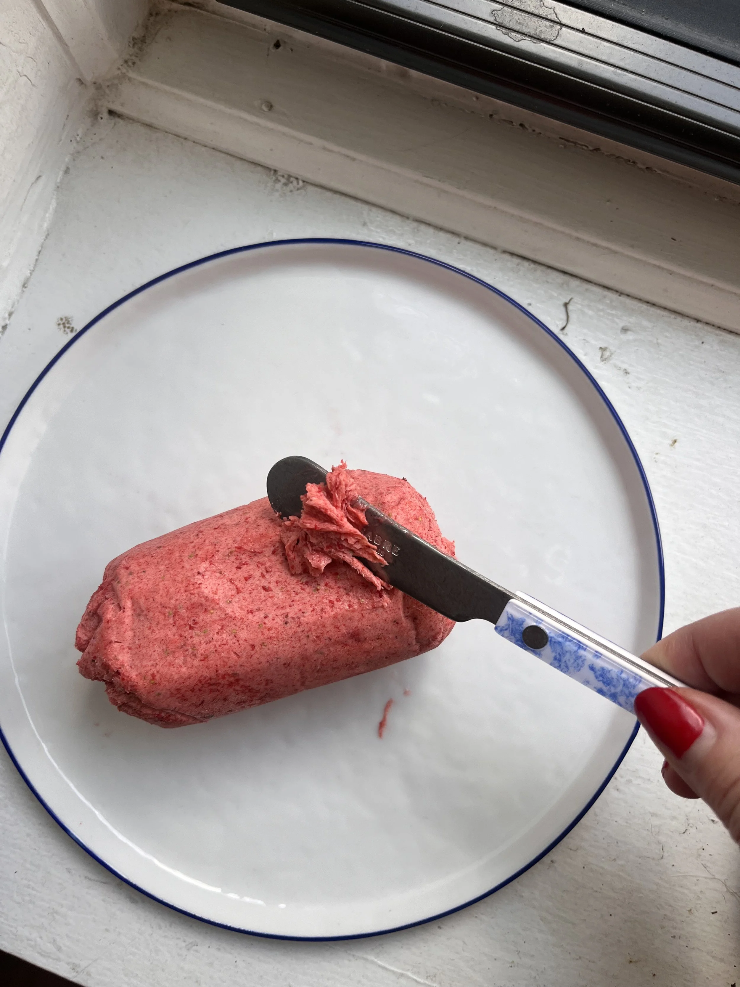 1. Make the strawberry butter by grinding half (about 12 grams) freeze-dried strawberries in a food processor into a fine powder. Once the butter is softened, place it in a medium-sized bowl and fold in the strawberry powder until well incorporated. The butter should be bright pink. Scoop the butter onto a sheet of parchment paper, roll it into a cylinder, and refrigerate for at least an hour or overnight. The butter itself will last up to 6 weeks.
